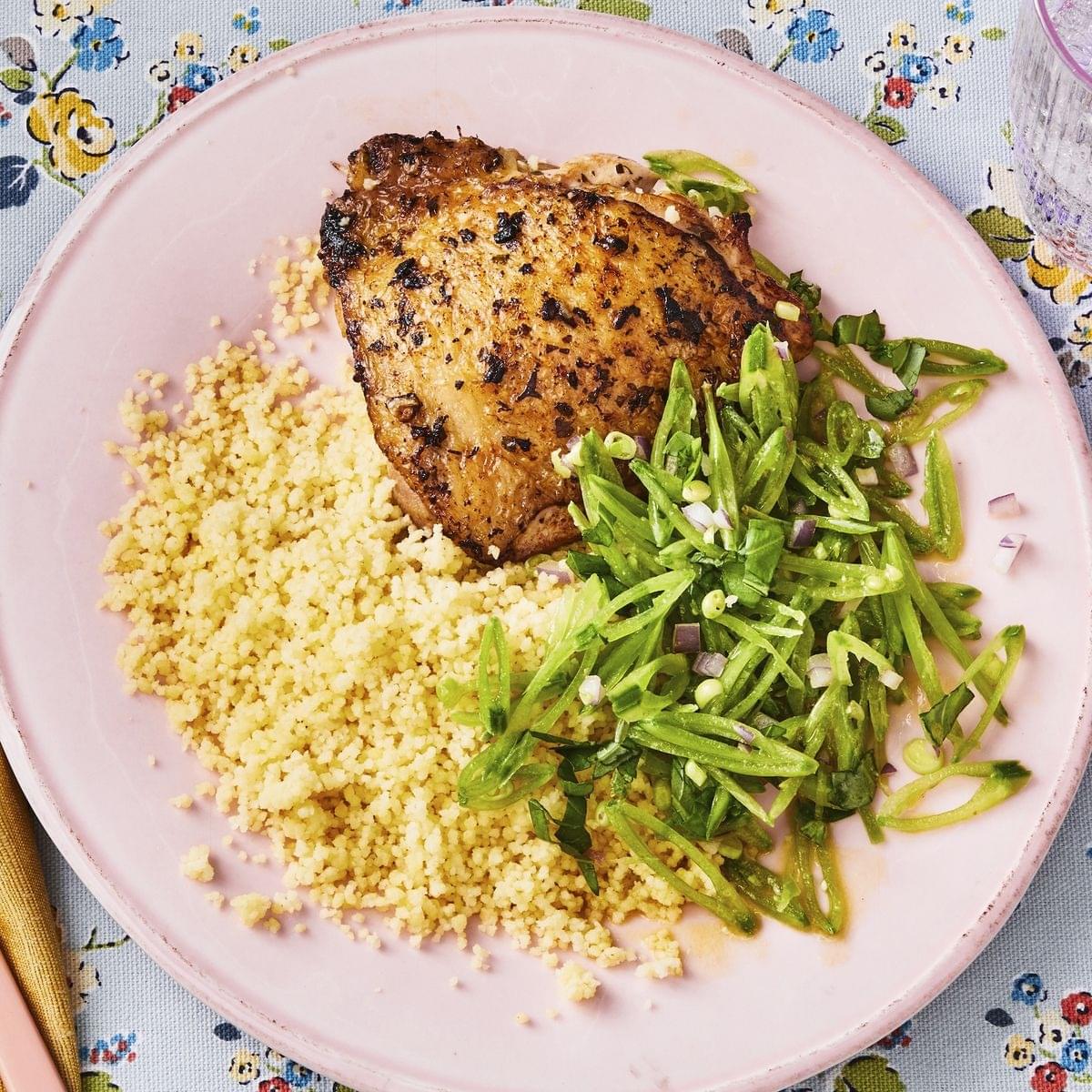 In a medium bowl, whisk together the remaining 5 tablespoons olive oil, the lemon juice, remaining 1⁄4 teaspoon; salt and the mustard until smooth. Add the snap peas, red onion and basil and toss to coat. Serve the chicken with the couscous and snap pea salad.